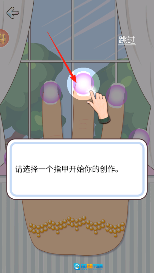 进入创作环节后,先挑选一根指甲作为起点,点击选中的指甲,即可开启涂甲油和贴装饰的操作流程。每根手指都能打造出独特的风格,让你尽情释放创意灵感。