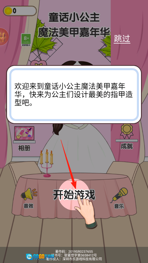进入游戏主界面后,点击开始游戏按钮,便能开启一场美甲创作之旅。你需要为公主设计专属的指甲造型,从挑选指甲款式、涂抹甲油,到添加各种装饰,一步步精心打造出独一无二的美甲作品。
