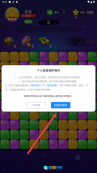 游戏启动后会弹出个人信息保护指引的弹窗,点击“同意并继续”按钮,就能进入消除关卡界面开始游戏。