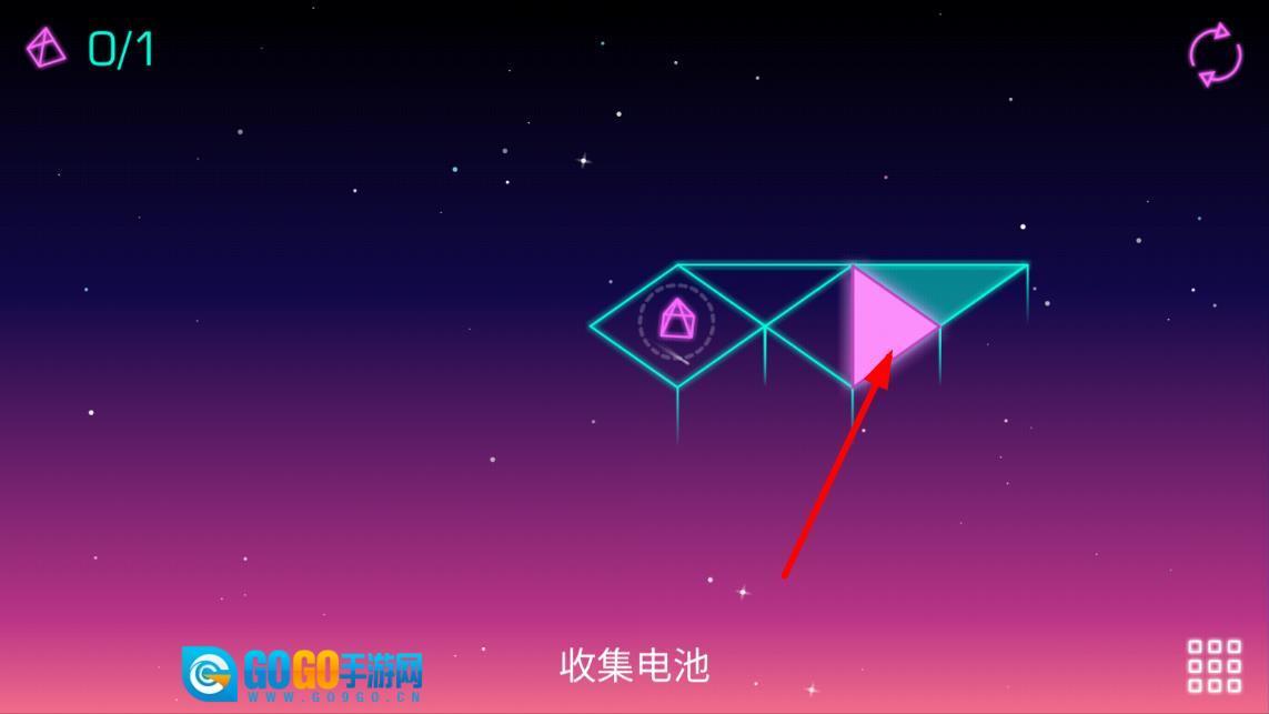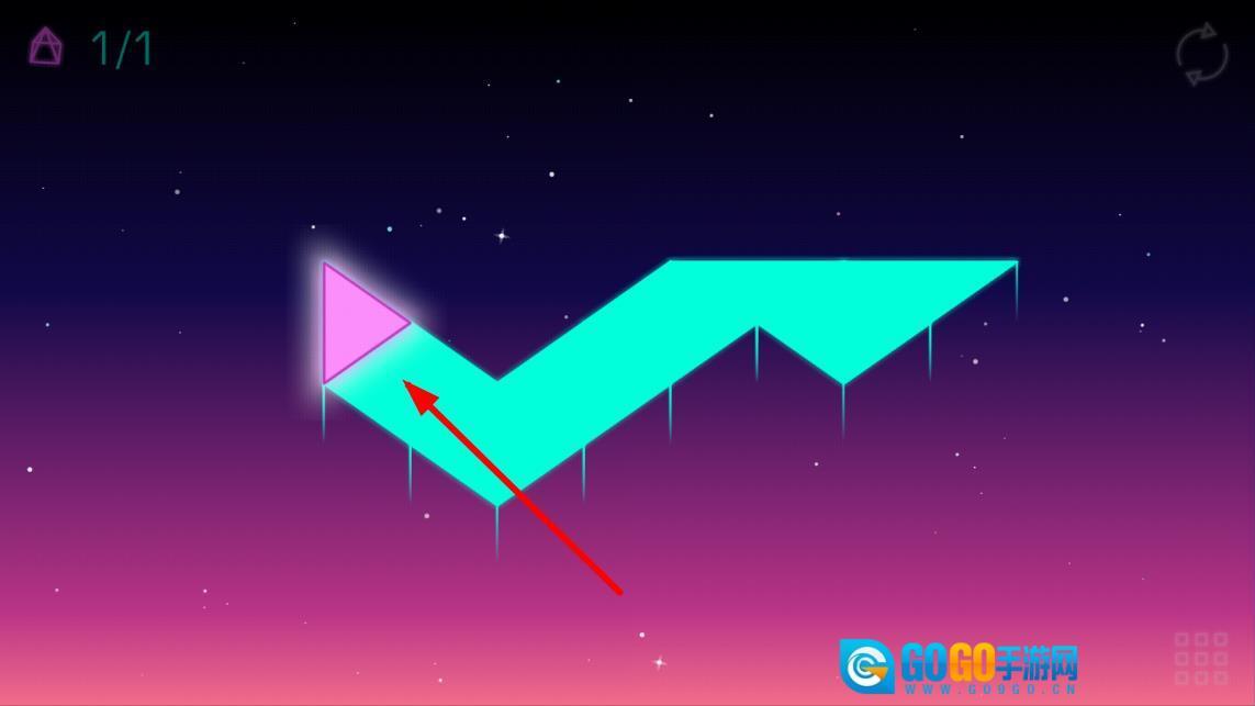 进入游戏后先选择初始关卡,接着操控三角形角色进行基础移动的尝试,体会对称的操作逻辑,收集第一个三角体,同时熟悉终点所在的位置。