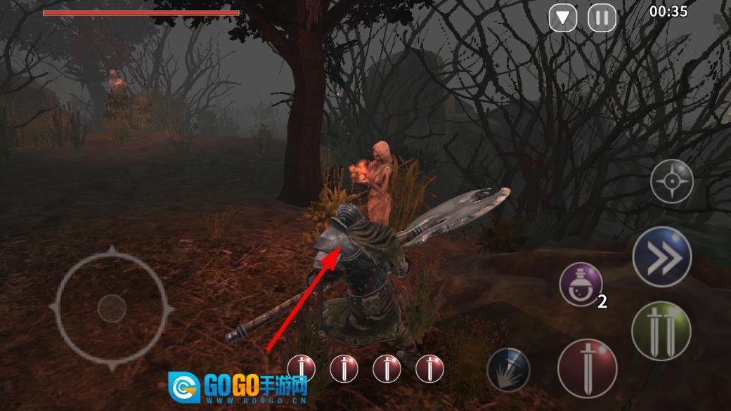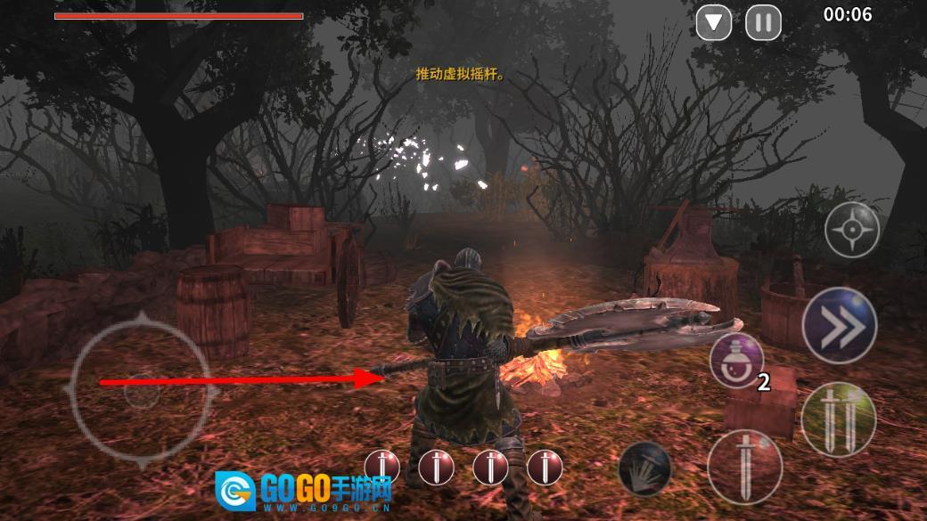 进入游戏后,先创建一个骑士角色,接着挑选初始武器和技能。之后在黑暗的场景里探索第一个区域,用虚拟摇杆控制移动,点击攻击键来消灭途中遇到的低级敌人,以此熟悉战斗的操作方式。