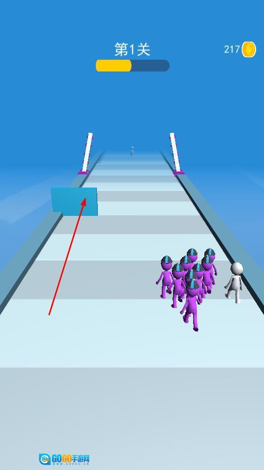 进入第一关后,你需要操控紫色小人沿着赛道移动,收集灰色小人来壮大自己的队伍,还要注意避开紫色的旋转障碍物,随时关注游戏的进展情况。