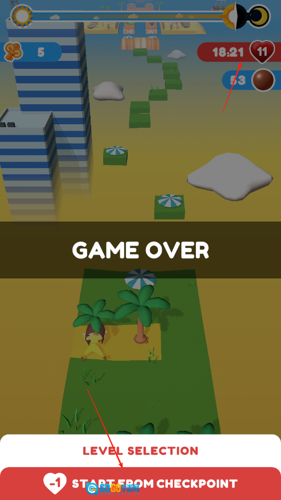 要是不小心撞到障碍物或者从平台掉落,可以用爱心回到复活点接着跑酷,右上角会显示我们能使用的爱心数量。