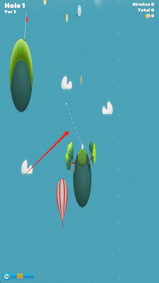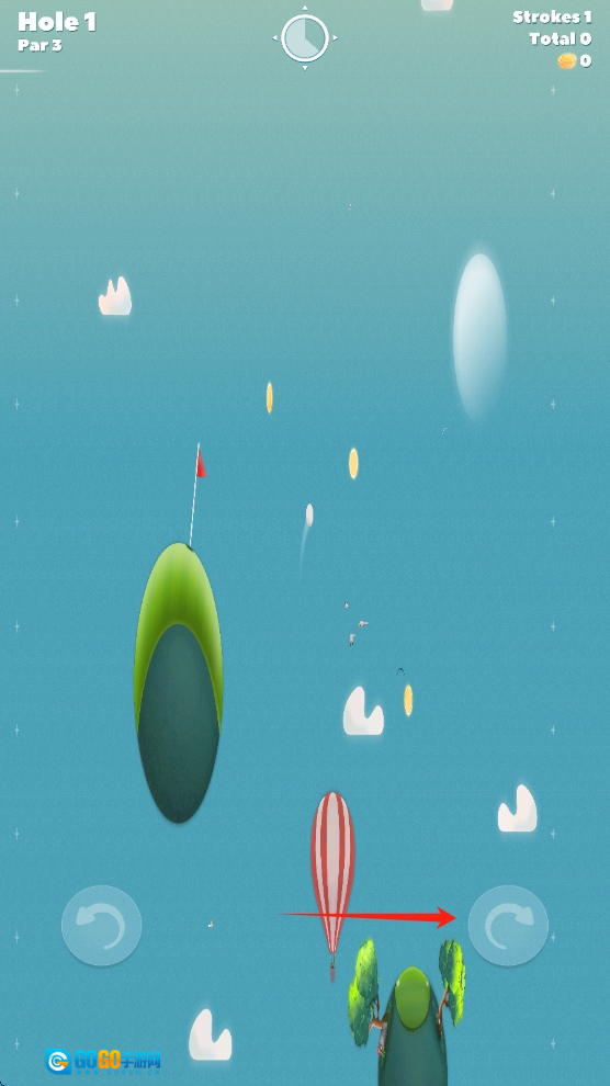 根据击球次数与总杆数来调整策略,点击重玩按钮优化击球表现,持续提升天空高尔夫的技巧,点击调整击球方向。