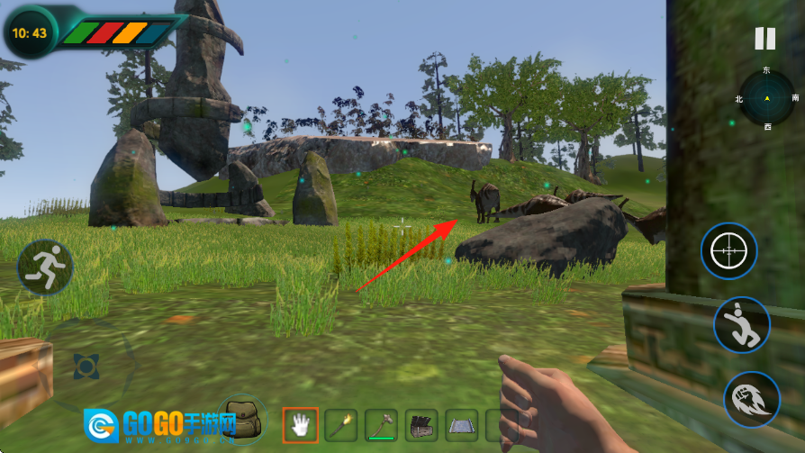 踏入开阔的场景,穿过草地与巨石阵区域,追寻食草恐龙的踪迹,为狩猎行动做好前期准备。
