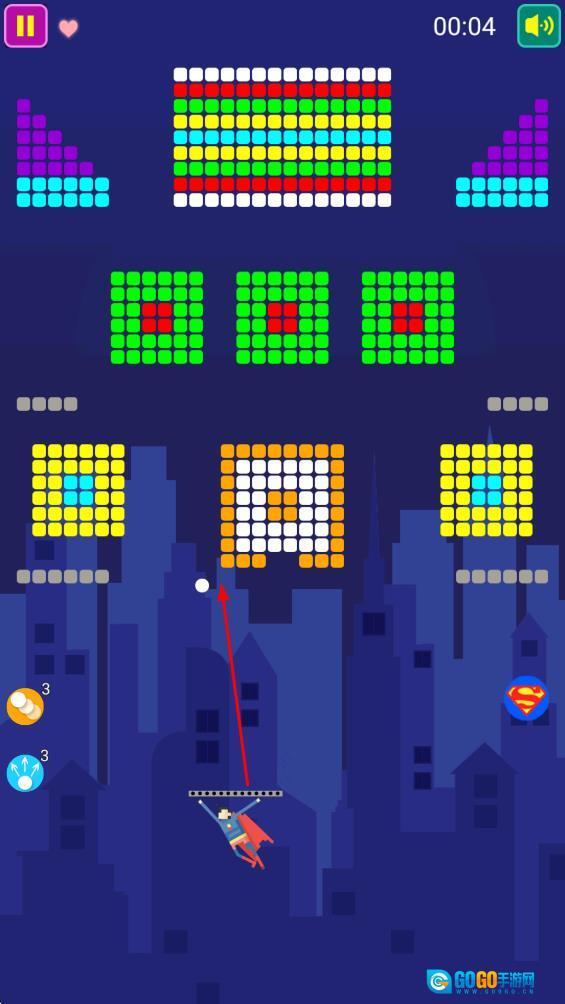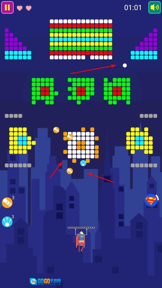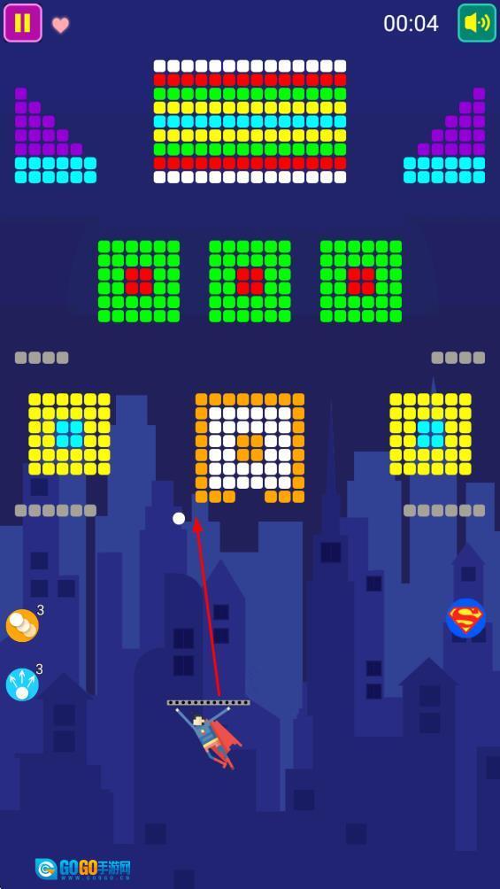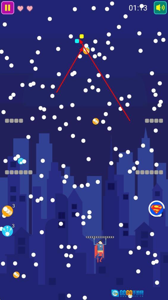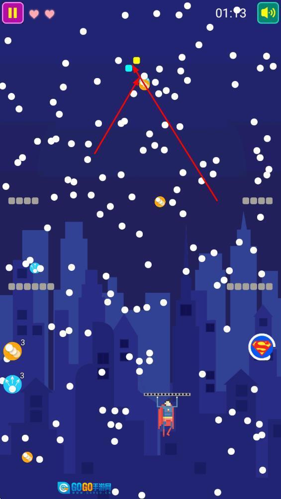 操控超人发射球体,瞄准上方的彩色方块,这是开启消除挑战的关键操作,能有效推动游戏进程。