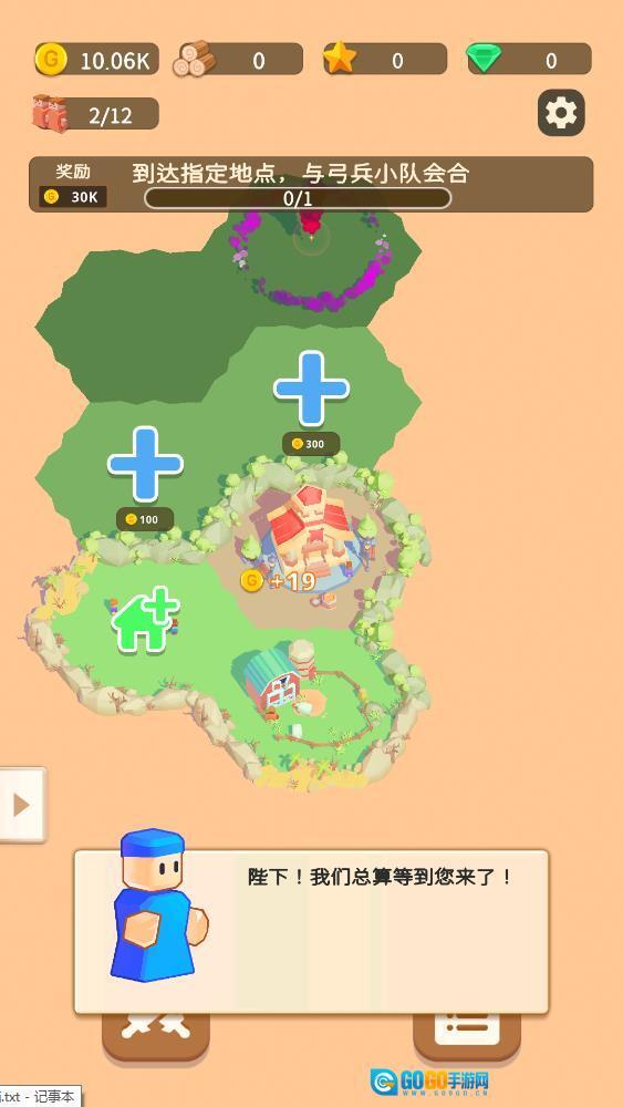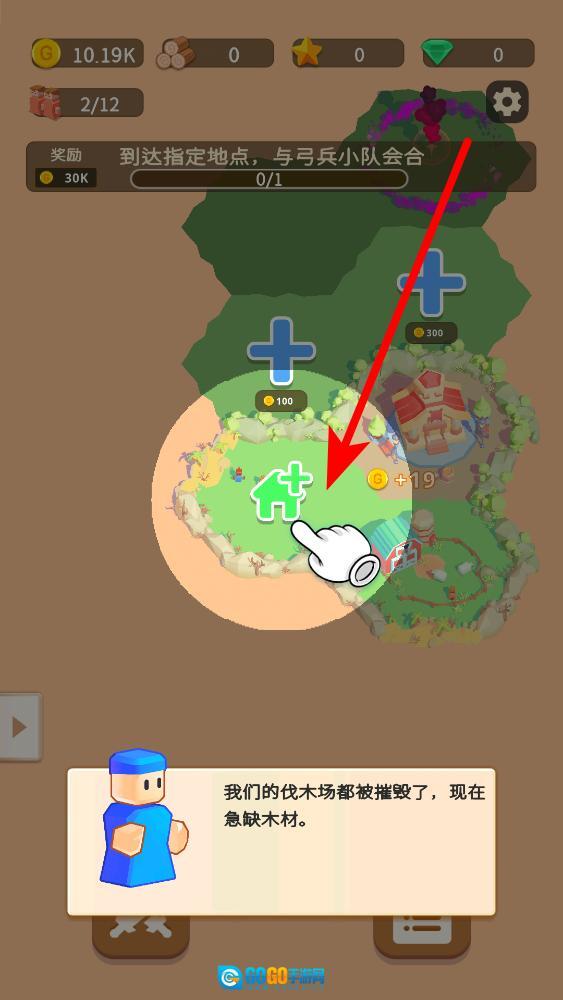 当前界面显示木材资源数量为0,需要点击那个绿色的加号建筑按钮,这样就能进入建造界面去获取木材。完成这一步操作后,不仅能让与弓兵小队会合的任务进度得到推进,还可以获得30K的金币奖励。