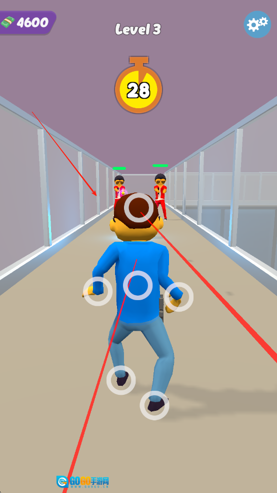 角色向前奔跑时,前方会出现持枪的敌人。我们需要在限定时间内,通过摆动头部、手部、脚部和腰身这四个部位,来躲避射来的子弹。