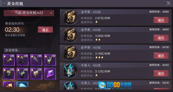 黄金挂机系统提供多个层数选项,角色等级越高,可挑战的层数上限也越高;每层对应不同等级的怪物刷新区域,怪物等级越高,角色战斗后获得的经验值就越丰厚。