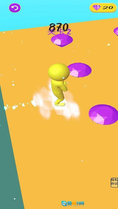 小人开始奔跑后,在彩色跑道上收集紫色宝石,沿途分布着加分道具。你可以通过左右滑动屏幕来控制小人的移动方向,需要避开跑道上的缺口,尽可能多地拾取宝石和加分项,这样能让小人脚下叠起的方块更高,从而顺利通过当前关卡。