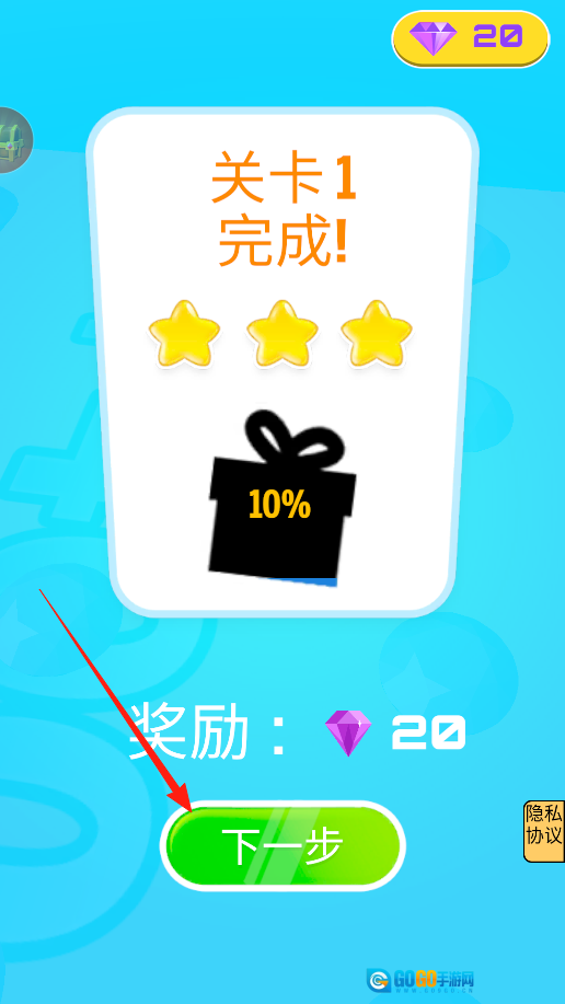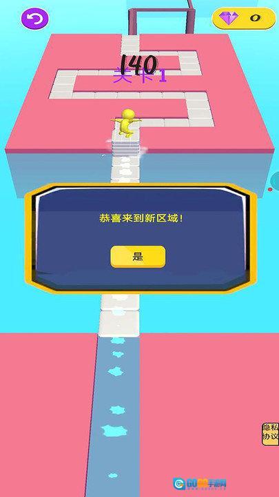 关卡1已顺利完成,成功获取星星与钻石奖励。接下来点击“下一步”按钮,即可开启全新关卡,挑战难度升级的跑道,收集更多宝石,尝试堆叠更高的方块,解锁更多关卡与丰厚奖励,尽情享受游戏乐趣,持续挑战下去。