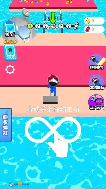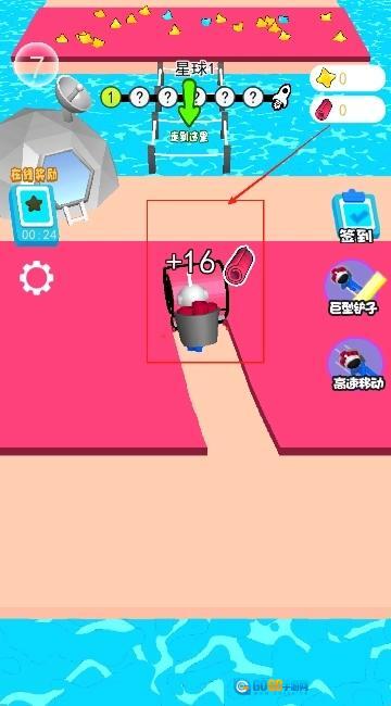 1、滑动手指操控戴花角色移动,收集黑色方块上的资源,留意左上角的18星标识以及右侧的签到、铲子等功能按钮。