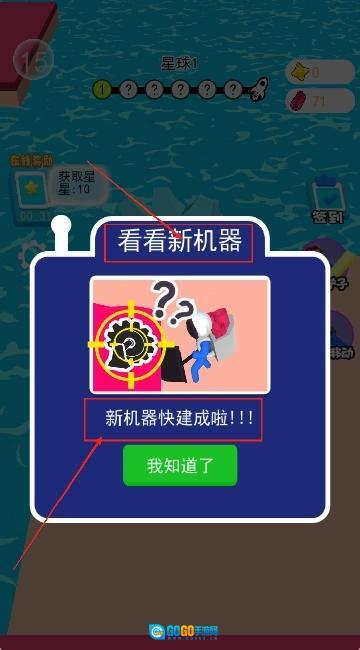 4、点击蓝色对话框里的绿色“我知道了”按钮,查看新机器的建造进度,继续收集71资源来解锁更多功能。