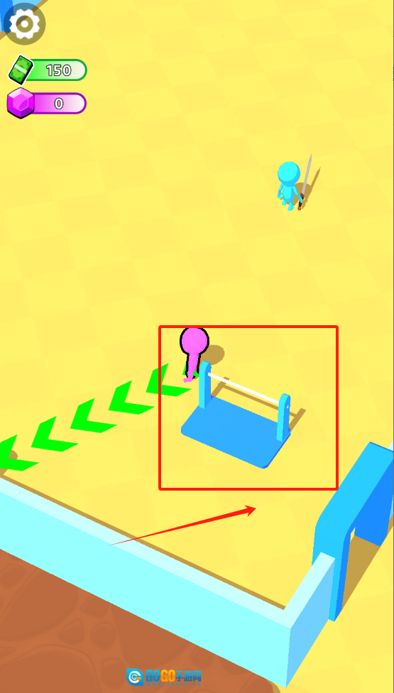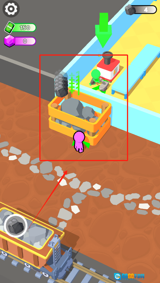 点击绿色箭头来移动粉色小人,操控橙色框里的石头,从而完成关卡任务。
