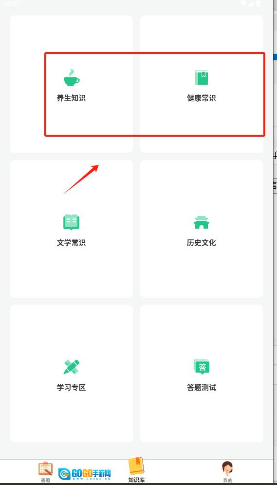 点击养生知识卡片即可开始答题,也可以切换至其他知识分类。
