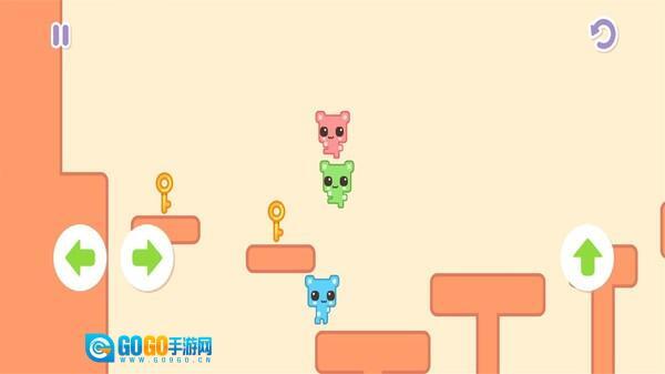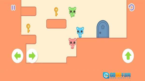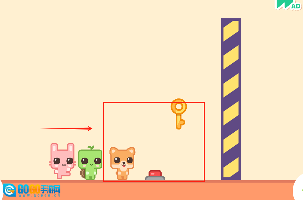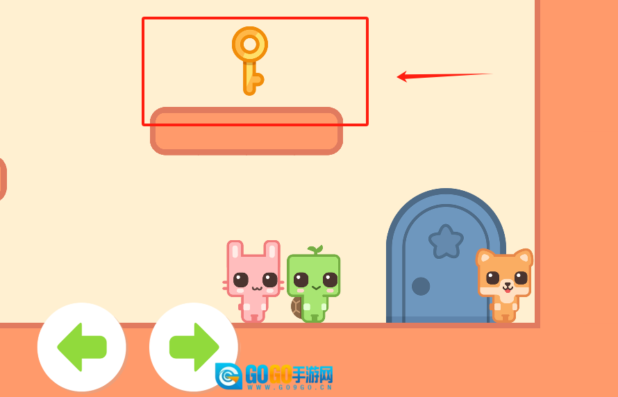 控制粉色兔子、绿色乌龟和小狗寻找钥匙,点击红色按钮启动机关以获取金色钥匙。
