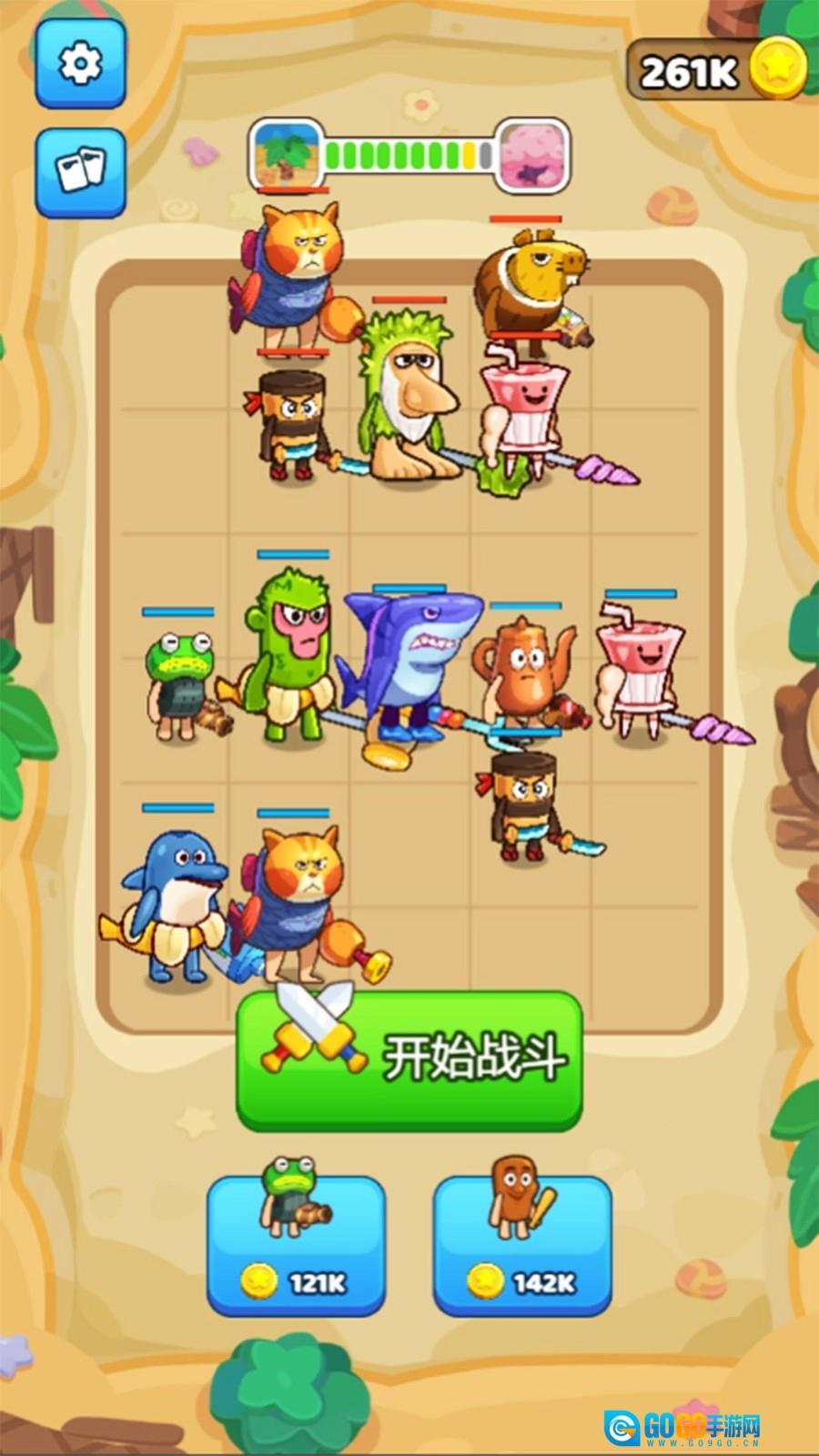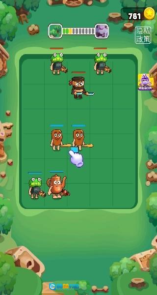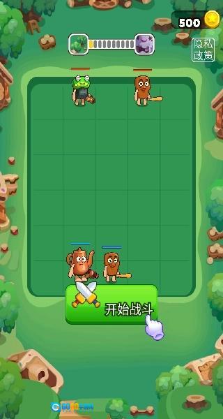1、操控初始角色木棍人和轮胎青蛙,通过合成同类型角色完成进化,增强战斗能力。