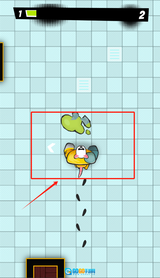 游戏进行时,左上角显示着数字1和绿色的电量条,中间角色的头顶有物品掉落,下方则有黑色脚印提示移动的方向。