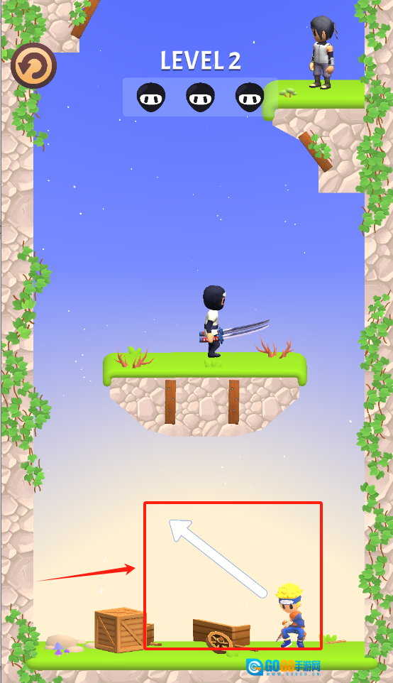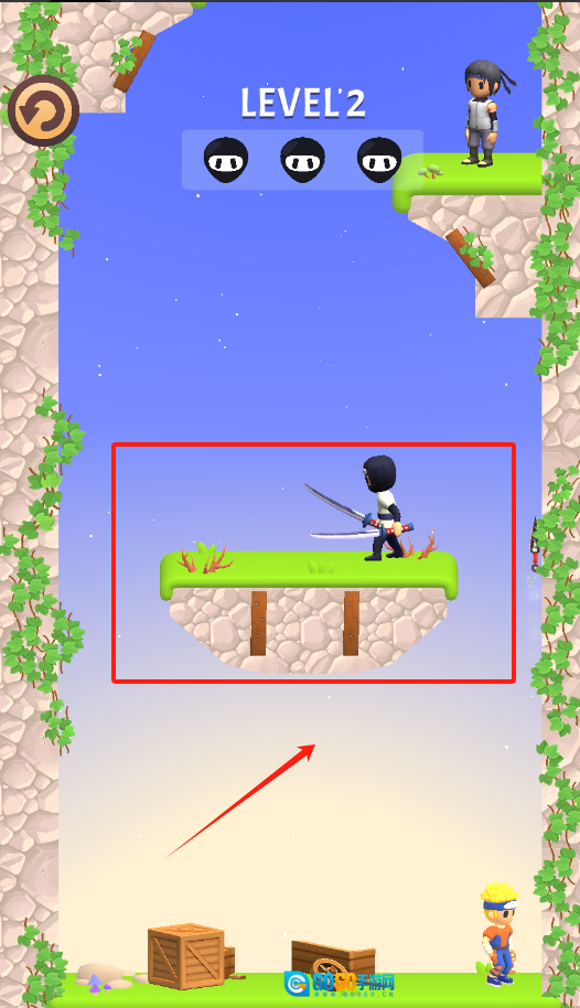 展示第二关的具体场景:黄发主角位于下方平台,上方有忍者敌人;红色箭头提示玩家需移动至木箱附近区域,准备迎击敌人。