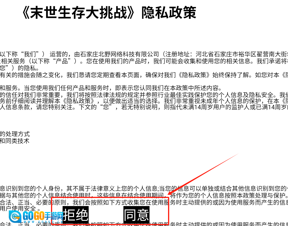 这一页展示的是隐私政策说明,内容说明了游戏公司收集个人信息的方式。阅读完毕后,需要选择点击同意或拒绝按钮,这两个按钮都有红框作为提示。