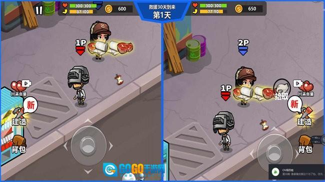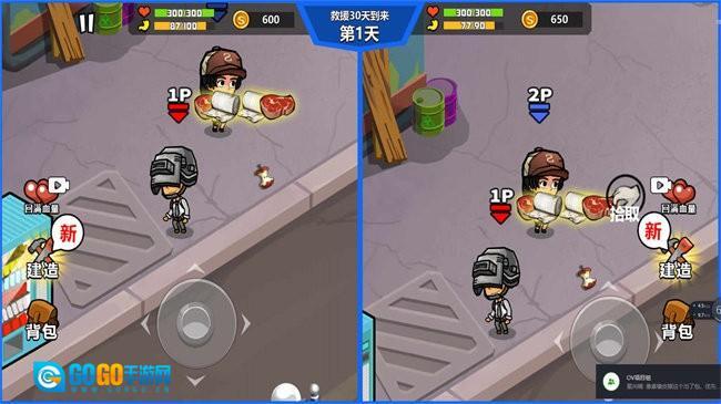 进入对战界面后,屏幕顶部清晰标注着1P与2P的位置区域。画面中央的垃圾桶是核心交互点,右侧则排列着回血、建造、背包三项功能按钮,其中新的建造图标会呈现发光效果。