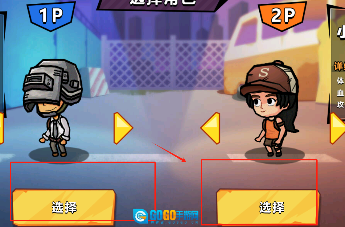 在角色选择界面,左侧是身着白衣、头戴头盔的男性角色,右侧则是戴着帽子的女性角色。选定角色后,点击黄色按钮即可确认选择,界面上的箭头指向右侧,提示推荐选择女性角色。