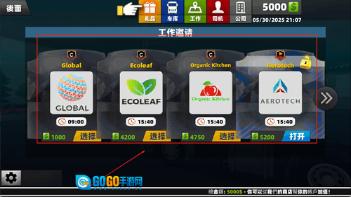进入游戏后,玩家可以查看当前可承接的任务,每个任务都会清晰标注货物类型、卸货地点以及里程单价,方便玩家从中挑选出最适合自己的选项。
