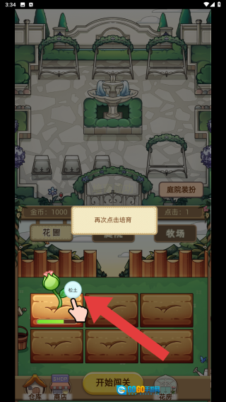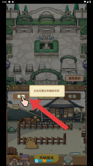 2、场景设定为庭院,划分有“花园”“牧场”等功能区域,同时配有“点击花圃去种植鲜花吧”的操作提示,这部分内容属于经营养成类游戏中种植操作的实体环节,玩家能够依据指引开展种植等相关玩法。