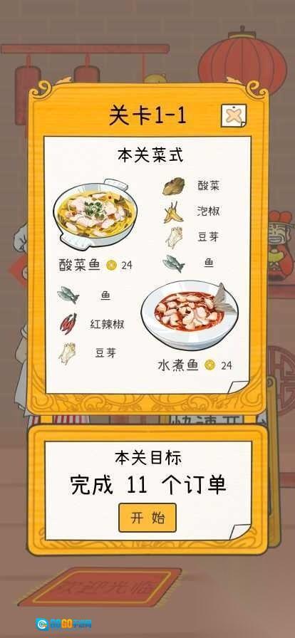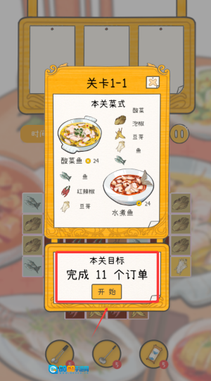 3、备齐酸菜鱼食材,点击开始完成11个订单目标。