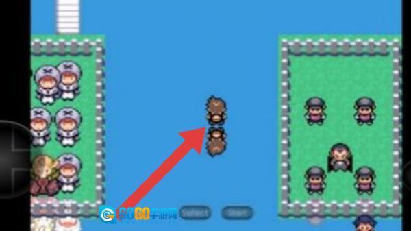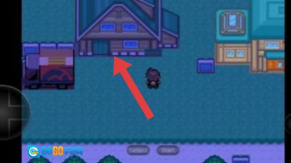 3、画面里存在一个角色,箭头指向的地方是一处房屋建筑,玩家控制角色在游戏世界里进行探索,这款游戏属于《口袋妖怪》系列的改版作品。