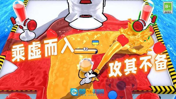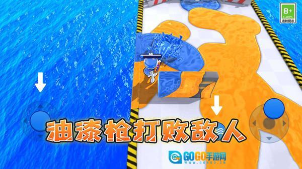 基础操作是用虚拟摇杆控制移动,按住射击键可以调整喷射角度,不同的染料枪在射程和扩散范围上存在差异。