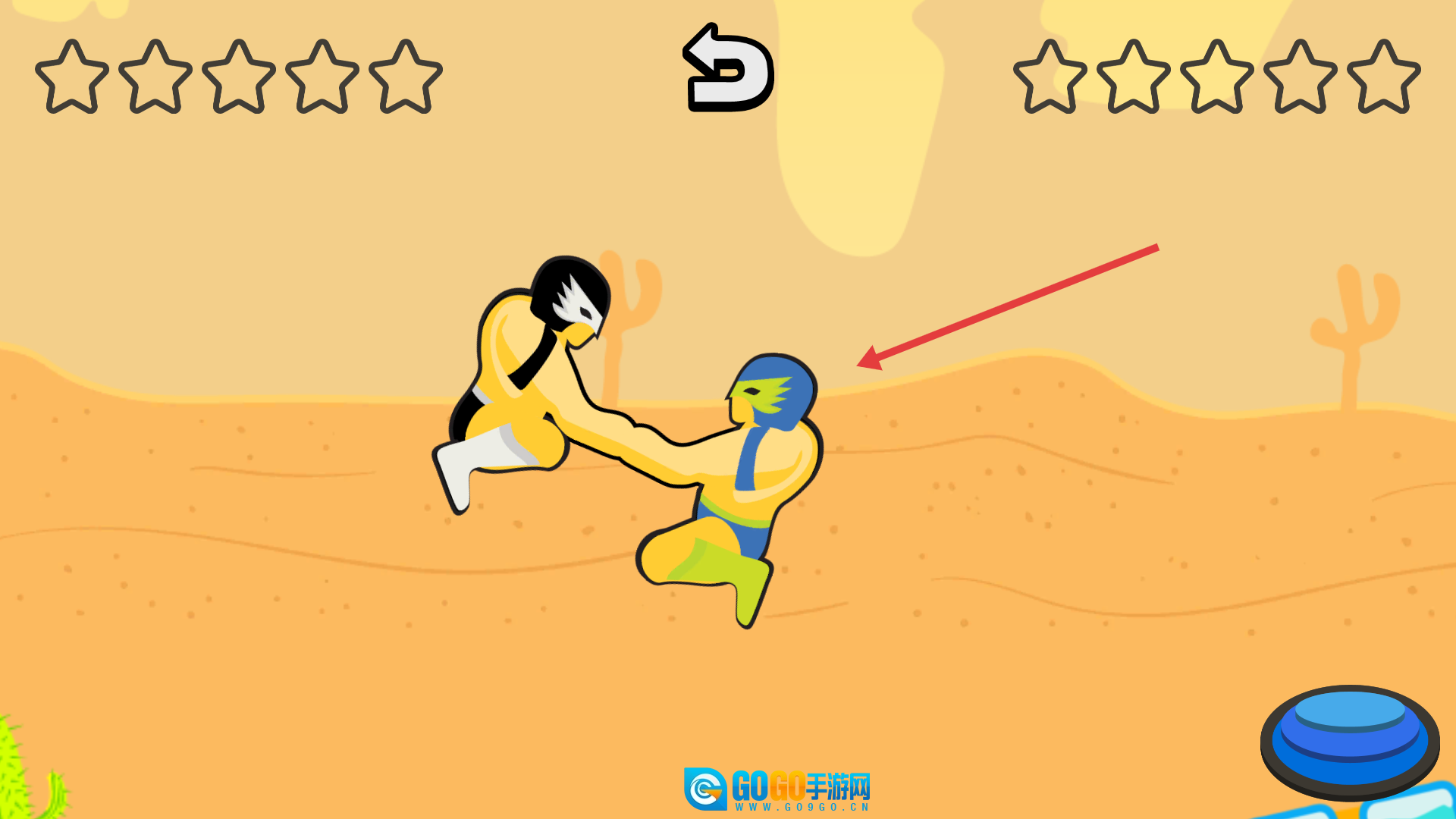 对战时点击蓝色按钮能让角色伸直腿部发起攻击,要找准时机,把对手的头部往地面方向推。
