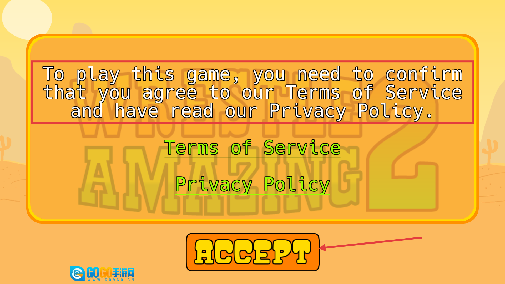 进入游戏前必须点击【ACCEPT】按钮,以同意【TermsofService】和【PrivacyPolicy】,这是开启游戏的必要环节。