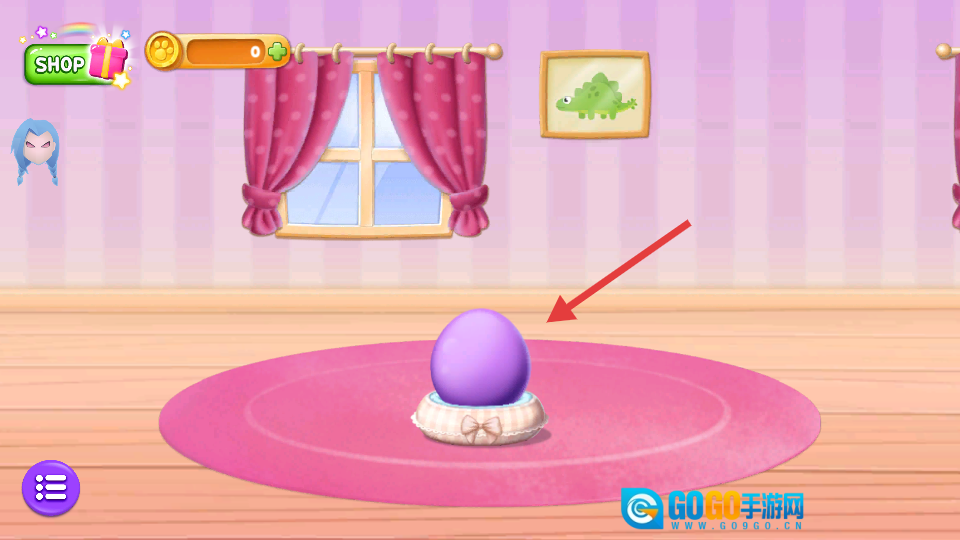 在房间场景,点击紫色宠物蛋,孵化出小宠物。