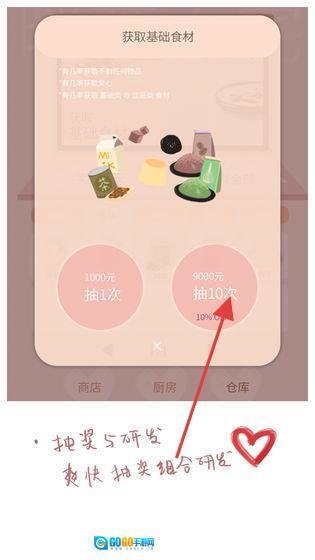 2、进入抽奖研发页面,选择“9000元抽10次”等选项,获取基础食材,这些食材可用于研发新的奶茶产品。