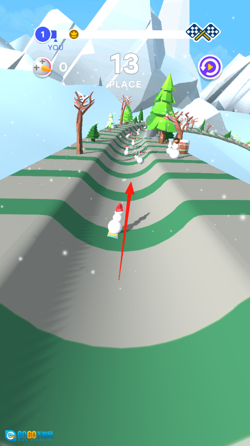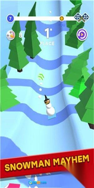 2、赛道操作 在起伏不平的冰雪跑道上,通过滑动屏幕控制雪人左右移动,避开树木、雪人等障碍,并超越其他雪人对手。