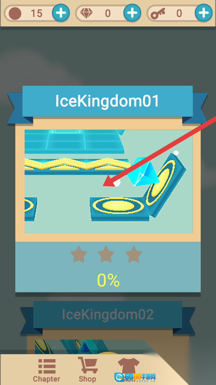 在螺旋滚球3D的关卡列表里,你得点击【IceKingdom01】这张关卡卡片,这样才能进入该关卡的挑战准备阶段。