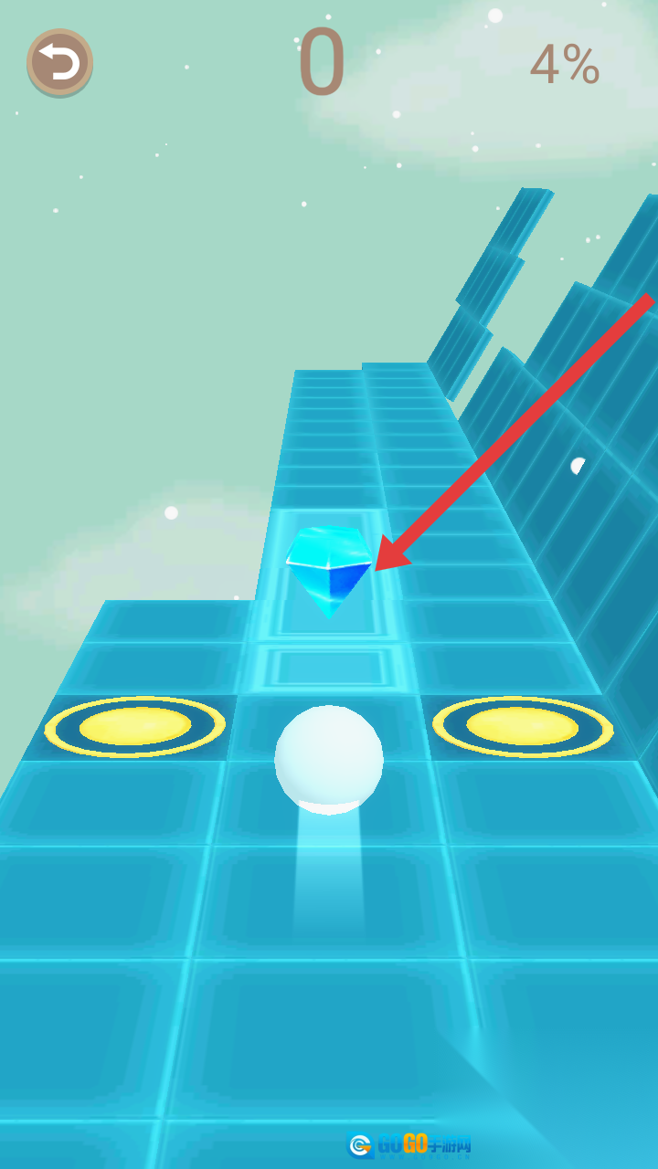 在螺旋滚球3D游戏里控制白球移动,优先拾取前方的蓝色钻石,同时避开两侧的障碍物,推动关卡向前进行。