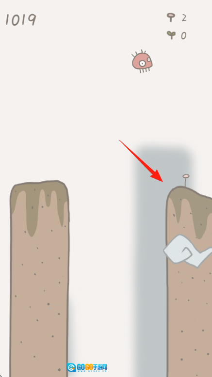 让小生物从高处跳下,精准落在【右侧带植物的土坡】,继续推进关卡进程。