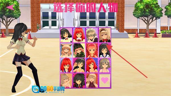 在校园操场的场景中,进入角色选择界面,挑选自己心仪的美少女角色(例如那个被箭头指向的黑发女生),为接下来的格斗做好准备。