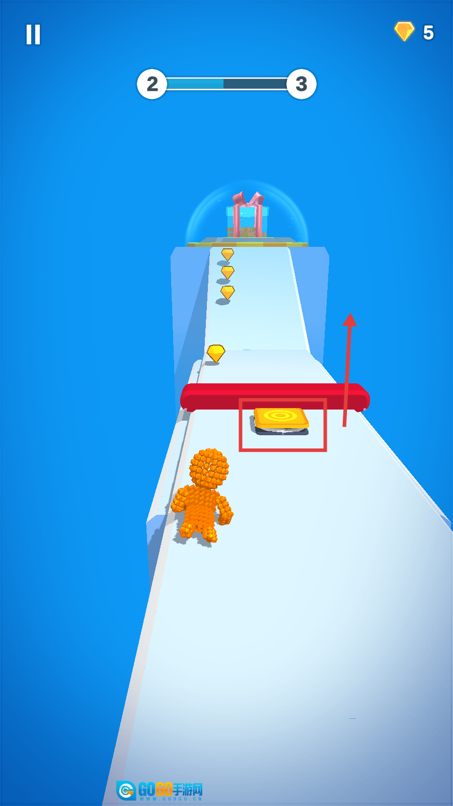当遇到黄色圆盘形状的机关时,要把握好时机滑动屏幕,使像素人依靠这个机关弹起来,越过障碍物朝着终点前进,突破自我赢得胜利。