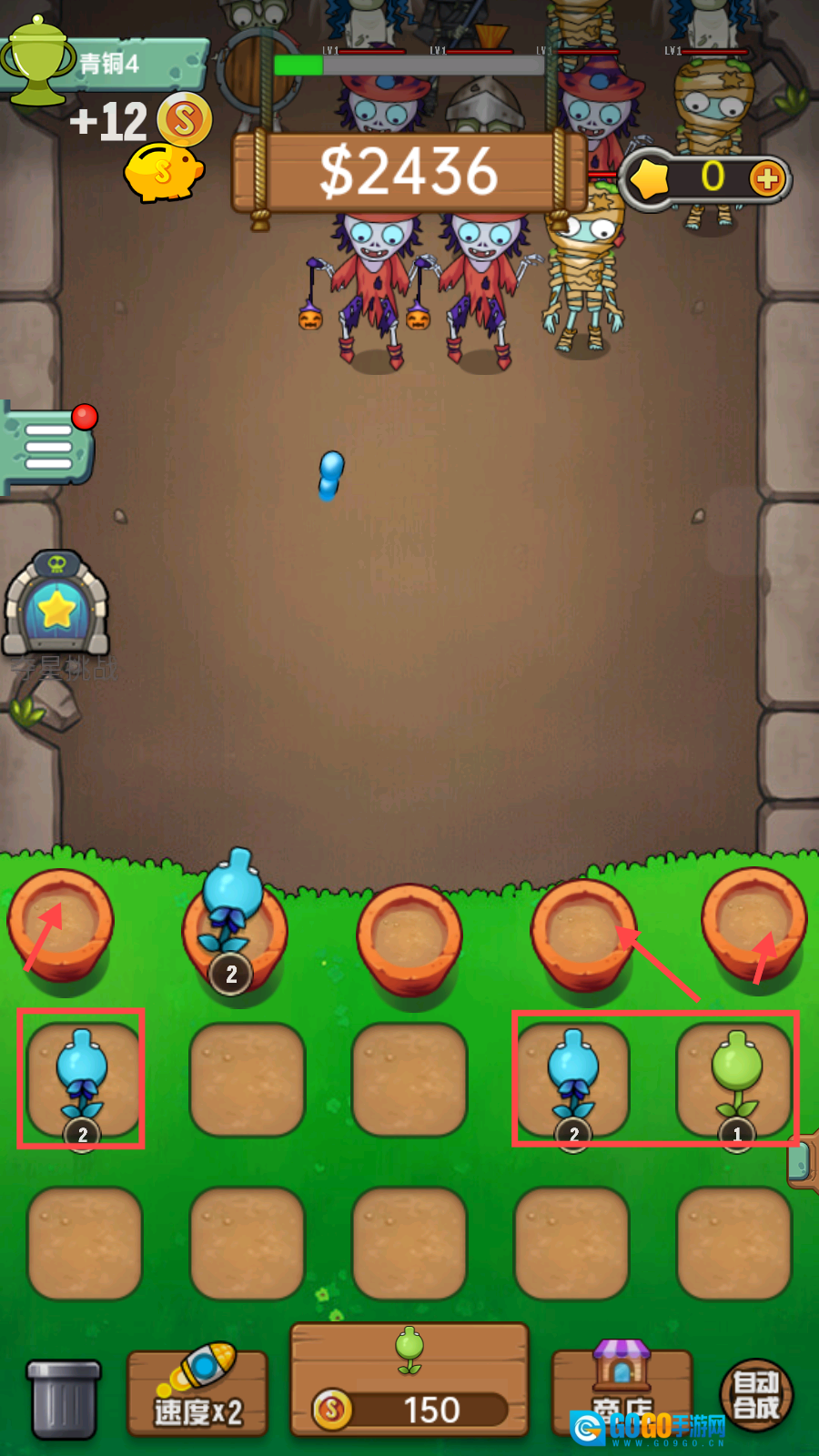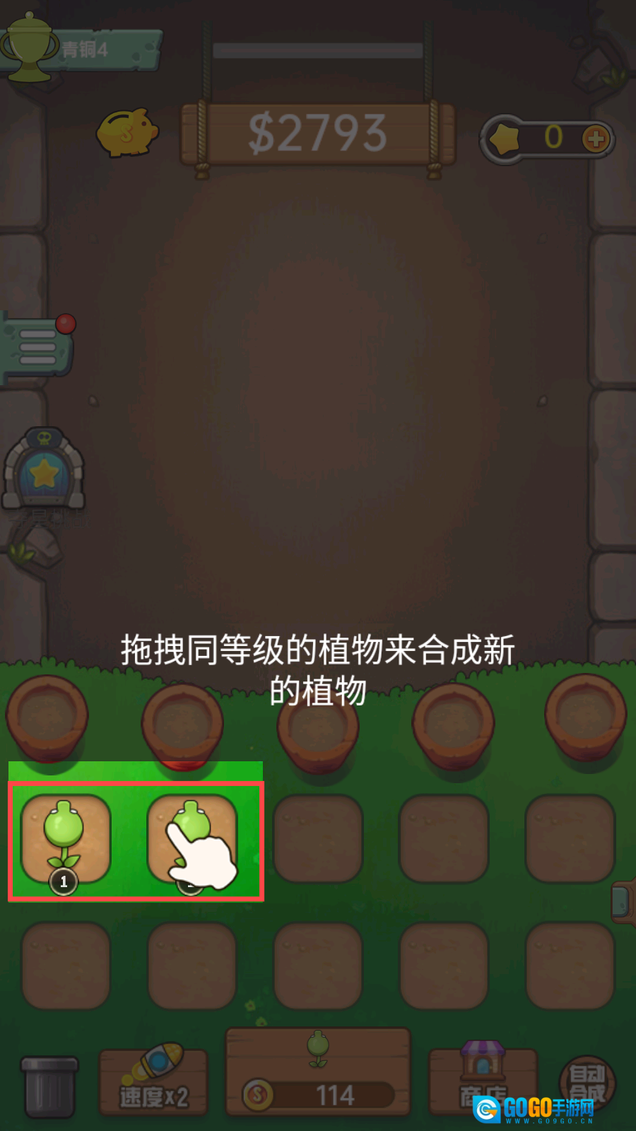 把两株等级相同的植物拖拽到一起进行合并,就能合成更高等级的植物,这样可以提升攻击能力来对抗丧尸。