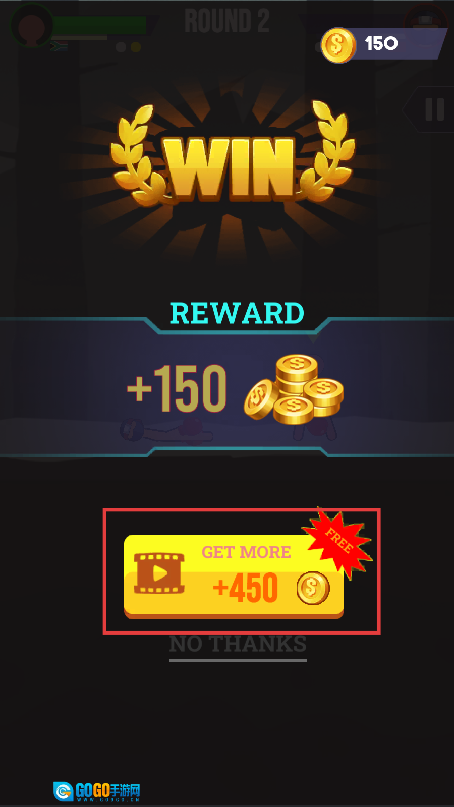 胜利后点击【GETMORE】观看广告,就能额外获得金币奖励,这些金币可以用来解锁新英雄或武器,助你在格斗场上大显身手。