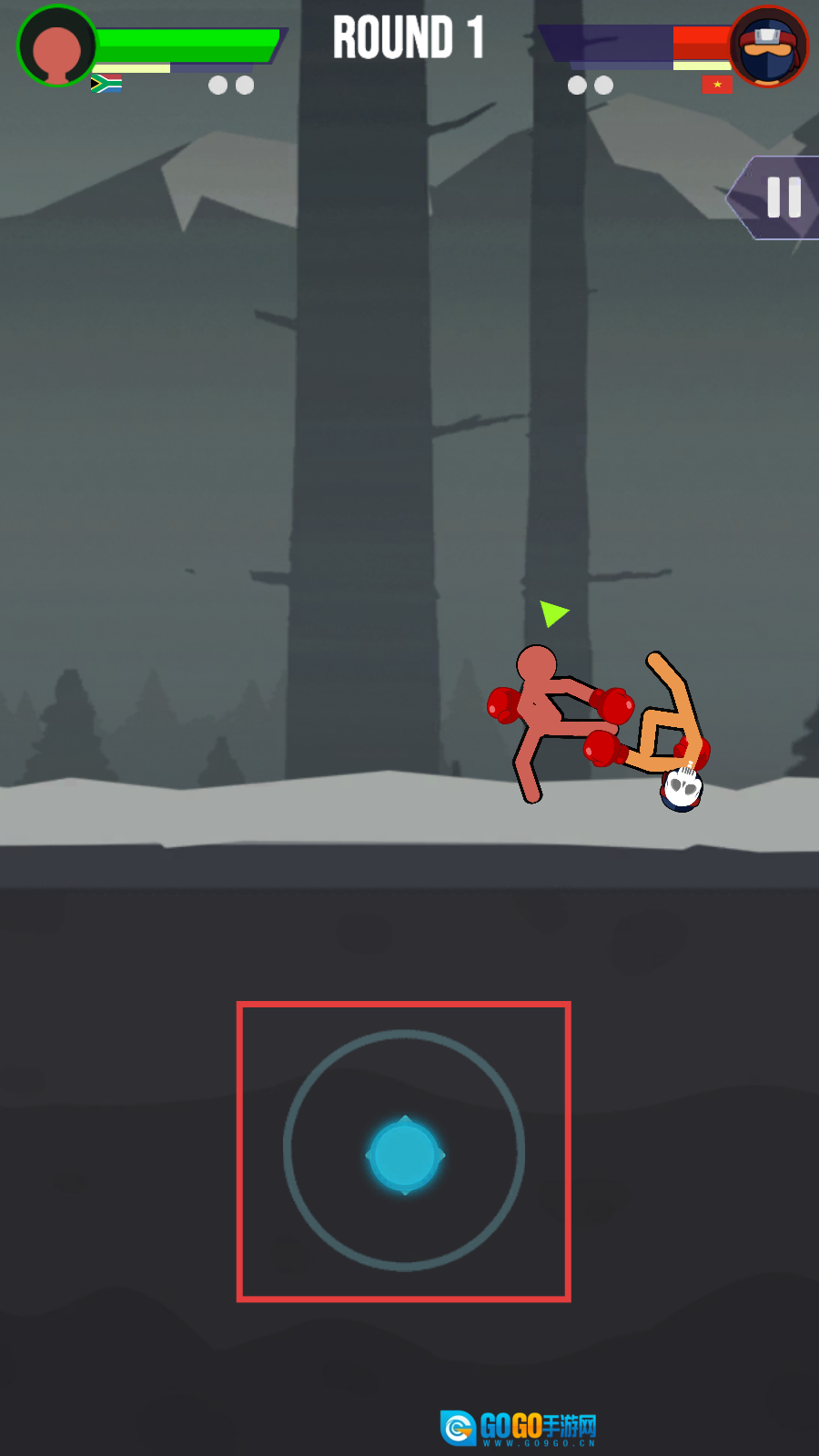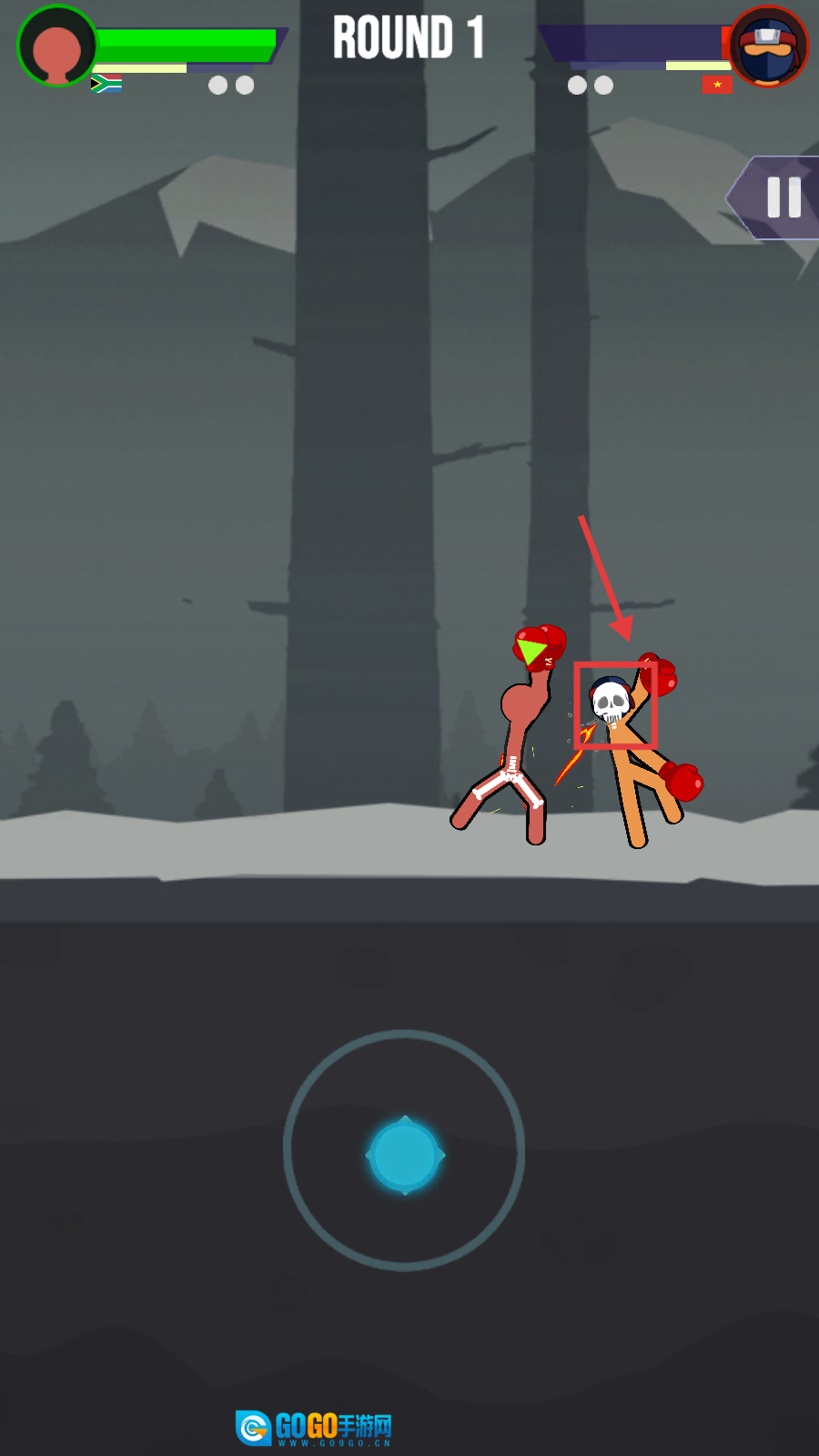 战斗时滑动底部的蓝色按钮,就能操控火柴人移动和出拳,和对手进行近身搏斗。