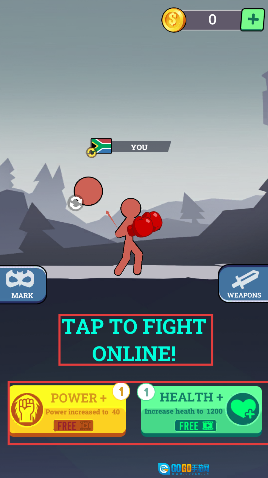 点击底部的【POWER】或【HEALTH】按钮就能提升火柴人的属性,等属性升级完成后,点击屏幕即可开启在线对战模式。
