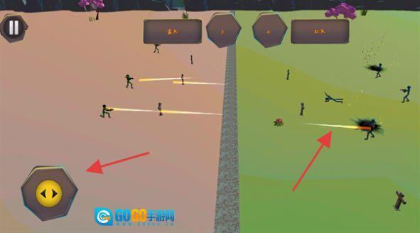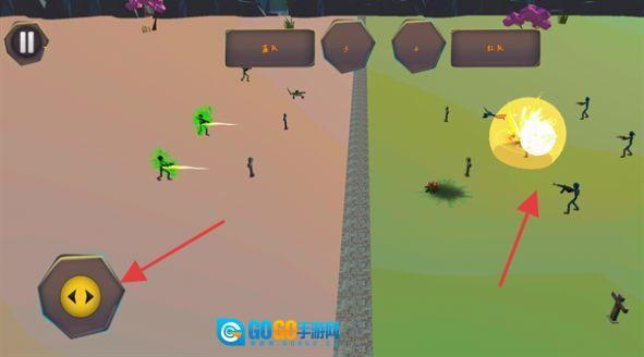 战场界面分为左右两个屏幕区域,点击左侧的按钮可以指挥部队进行移动,右侧则用于操控战斗环节,释放火力来对抗敌方的火柴人。