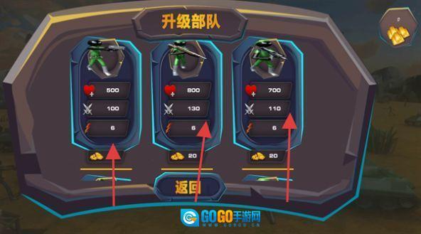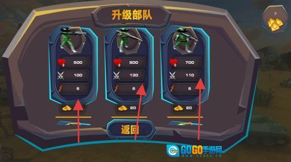 进入“升级部队”界面后,通过消耗金币来提升绿衣火柴人这一兵种的血量与攻击力,以此增强整体战力。