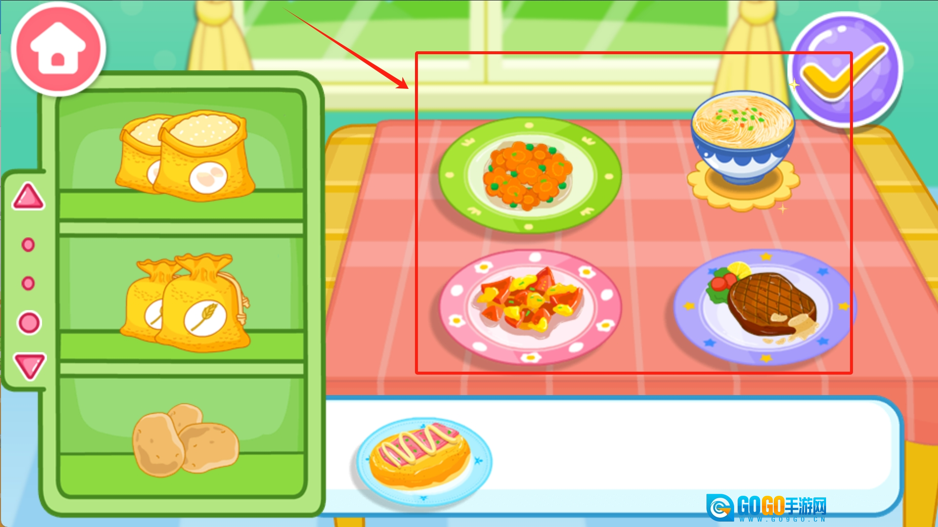 现在来帮小朋友挑选午餐的食材吧,要记得选绿色的蔬菜和红色的肉类哦。点击胡萝卜和牛肉放进餐盘里,这样搭配营养才均衡呀。