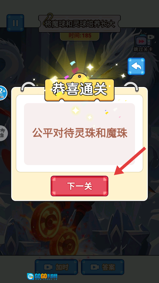 通关之后会出现【公平对待灵珠与魔珠】的提示,点击红色的【下一关】按钮就能继续挑战后续关卡。