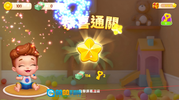 通关后获取星星、钞票、钥匙奖励,点击屏幕继续。